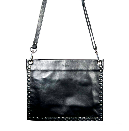 La Metal Bag es una bolsa de 30 cm de ancho x 25 cm alto, con correa ajustable para usarla cross body o al hombro. Perfecta para salir ligera, a diario o por la noche. Tiene forro y bolsillo interior con cierre, y remaches por ambos lados, en color plata y en latón viejo.