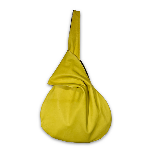 La bolsa triangular tiene gran amplitud – 40 cm x 60 cm – bolsillos interior y exterior, aro abatible para llaves, broche de seguridad; la suavidad de su piel y su forma la hacen extraordinaria.