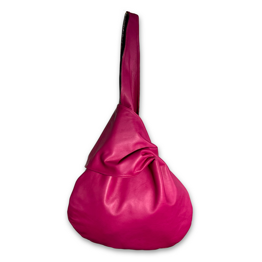 La bolsa triangular tiene gran amplitud – 40 cm x 60 cm – bolsillos interior y exterior, aro abatible para llaves, broche de seguridad; la suavidad de su piel y su forma la hacen extraordinaria.