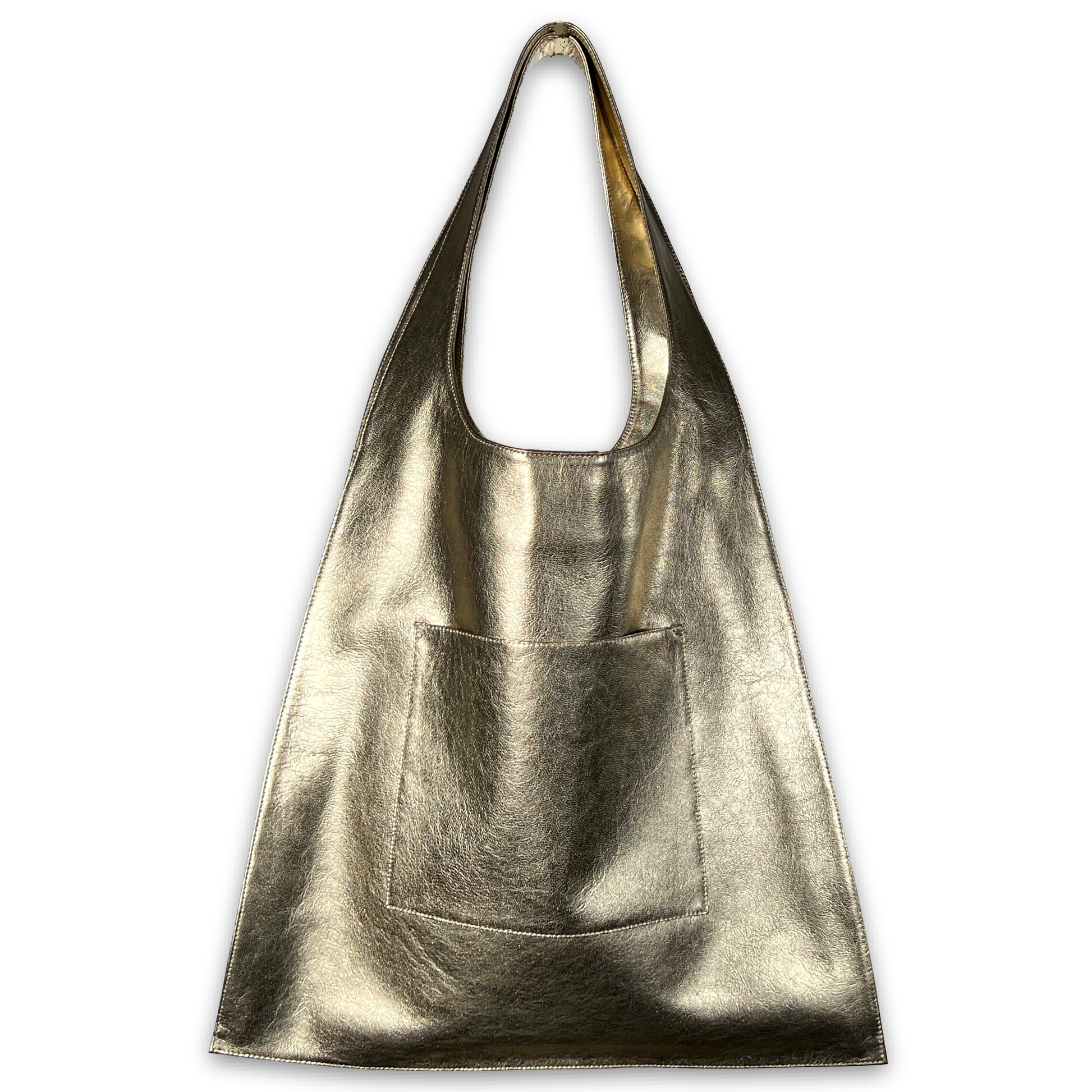 Nuestras pieles metalizadas tiene un brillo discreto, una textura, son suaves y resistentes. Medida: 40 cm x 63 cm. Forro interior, bolsillo exterior e interior, broche y herraje metálico para llaves.